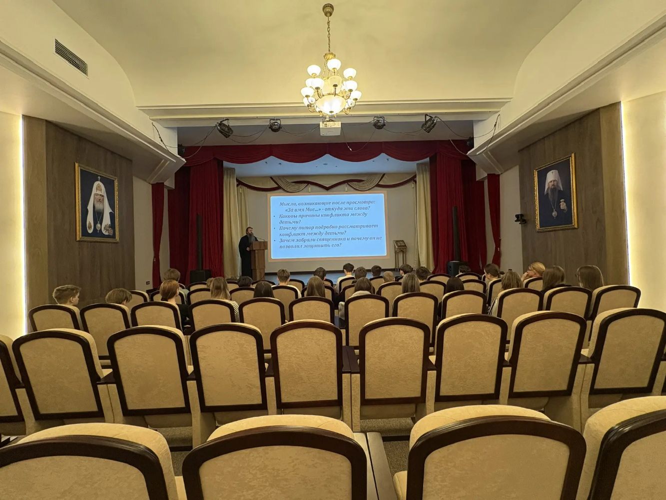 После экскурсии в зале Церковных собраний состоялся просмотр фильма «За имя Мое…», который поднимает важные духовные и нравственные вопросы. По завершении просмотра иеромонах Марк (Корнилов) обсудил с детьми просмотренный фильм, подробно раскрыл смысл картины и ответил на вопросы, возникшие у юных зрителей.