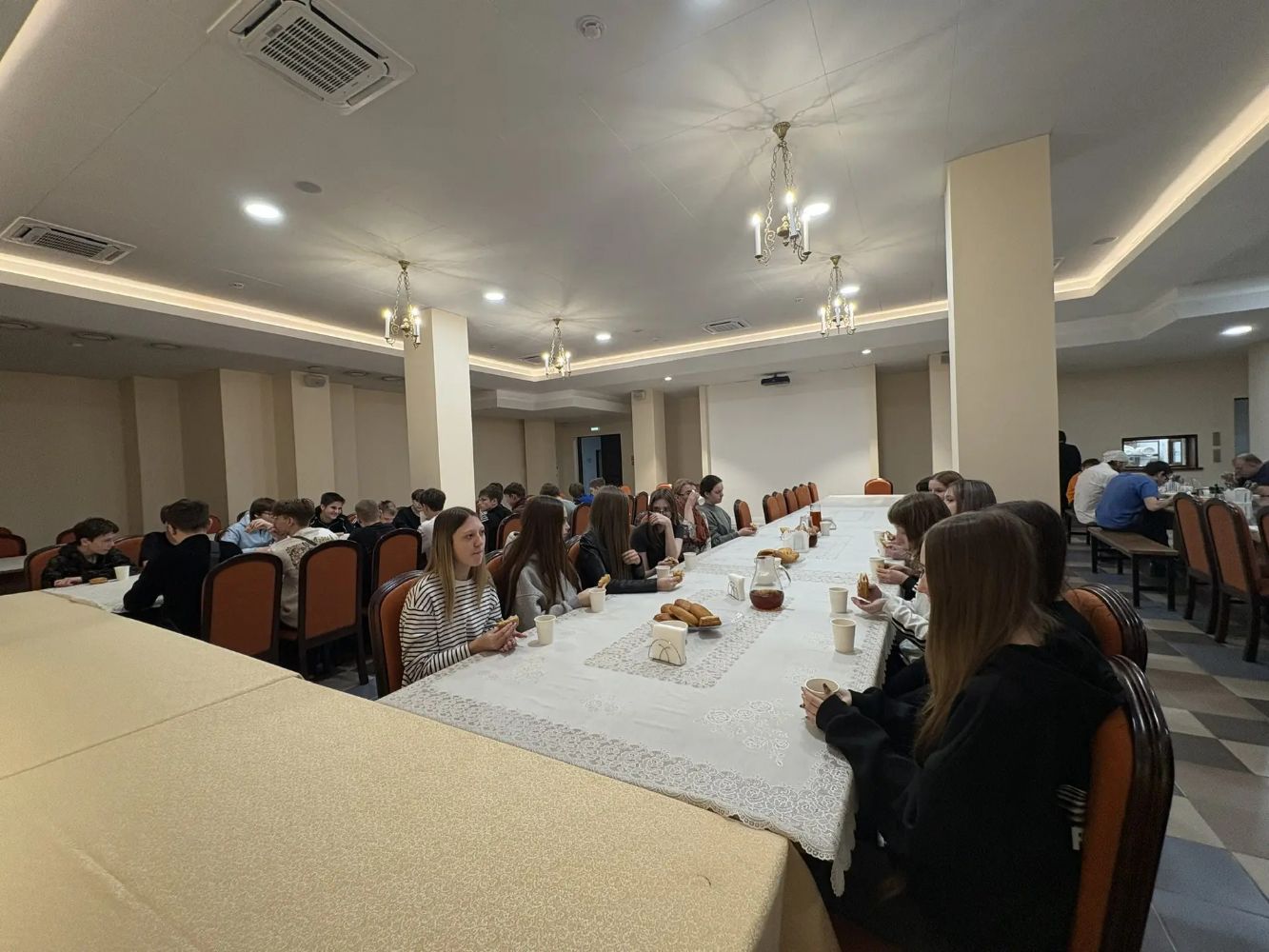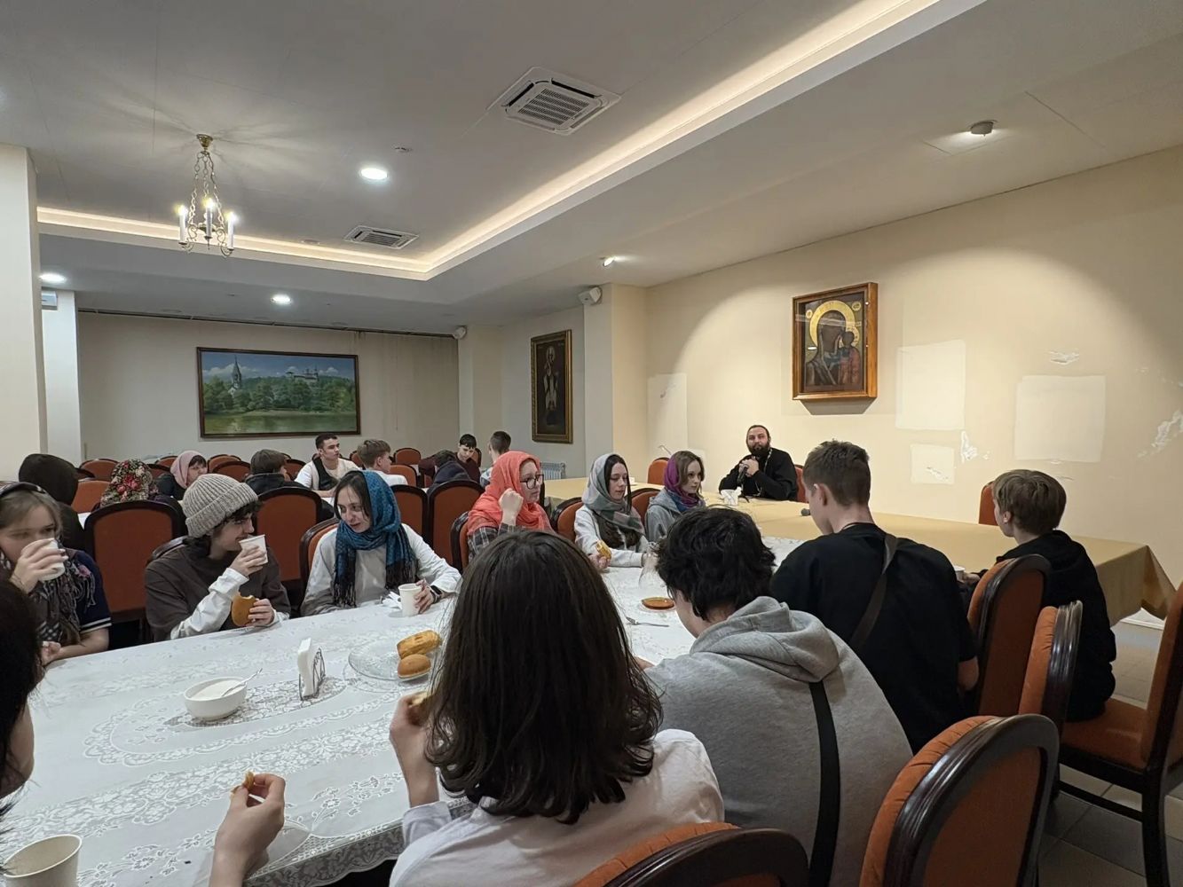 Встреча продолжилась в неформальной обстановке за чашкой чая и свежей выпечкой, которую предоставила компания «Владхлеб». Отец Александр побеседовал с ребятами о вреде лени, важности усердия в учёбе и помощи взрослым, а также дал наставления.