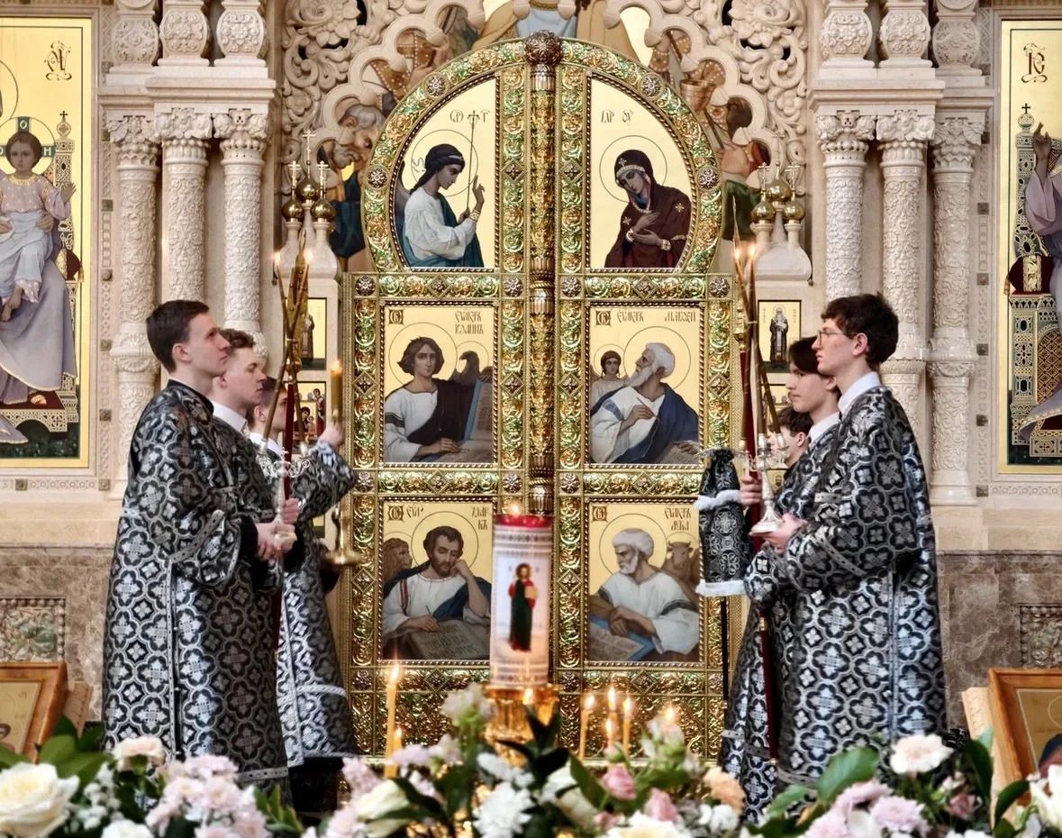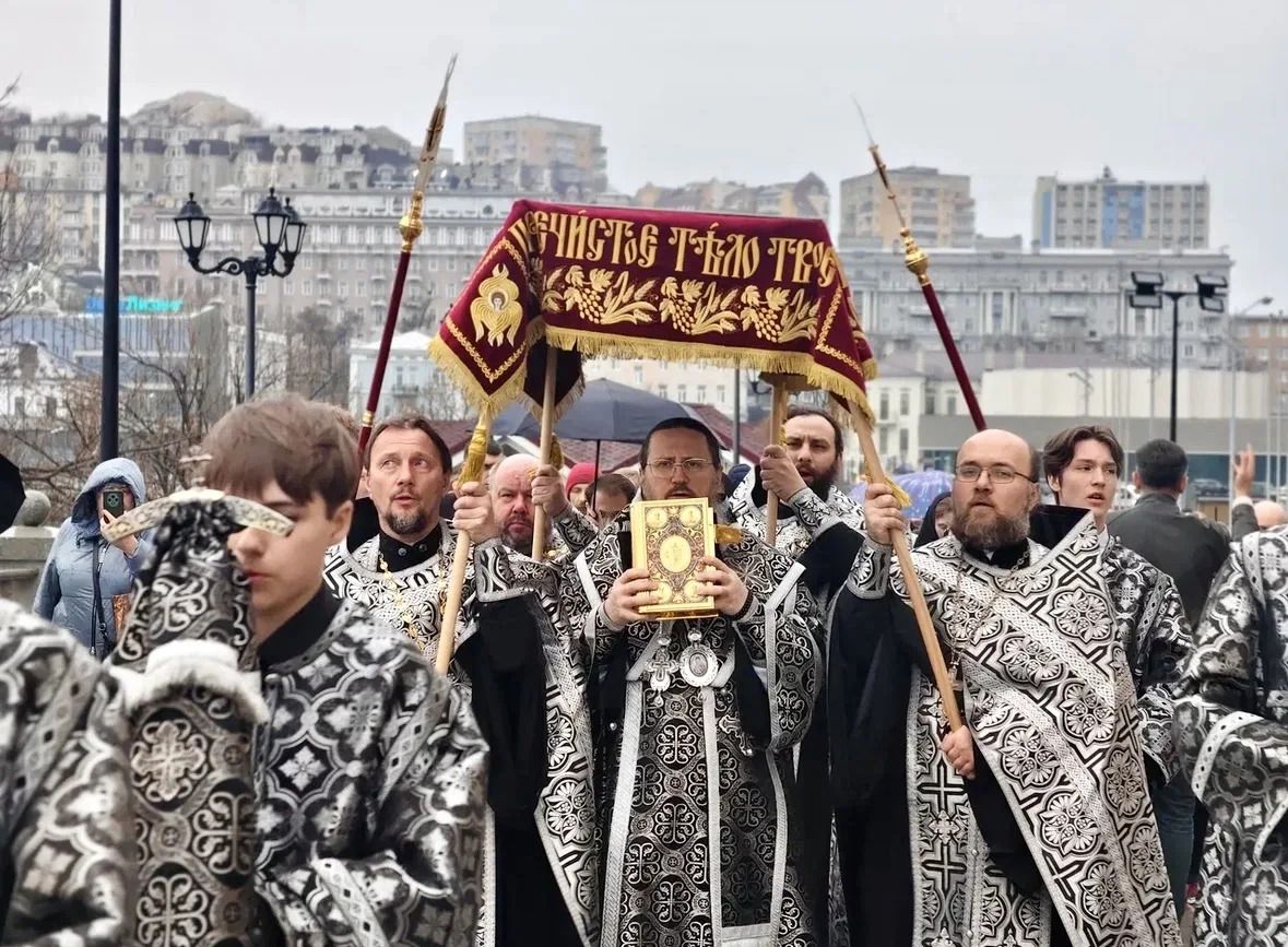 После Великого славословия перед плащаницей, под пение «Святый Боже» священнослужители подняли плащаницу и во главе с владыкой прошествовали вокруг храма. Сонм духовенства, клира и мирян совершил крестный ход с плащаницей, который символизирует погребение Христа и позволяет всем верующим стать соучастниками этого трагического, но спасительного события.