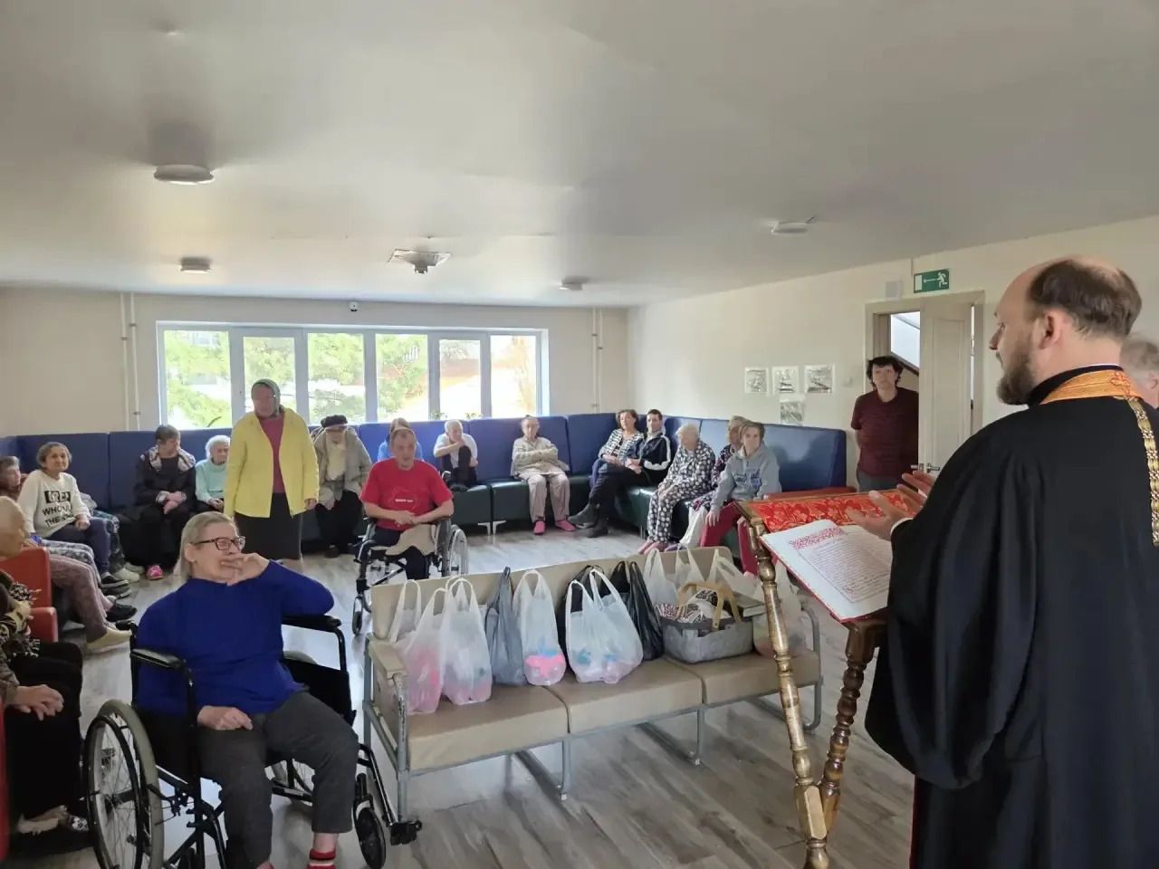 Во время встречи священнослужители совершили пасхальный молебен, рассказали присутствующим о Светлом Христовом Воскресении и поздравили всех с великим праздником Пасхи. Подопечным пансионата были вручены пасхальные подарки: кулич, яйцо, иконка, газета «Фома» и буклет с информацией о празднике.