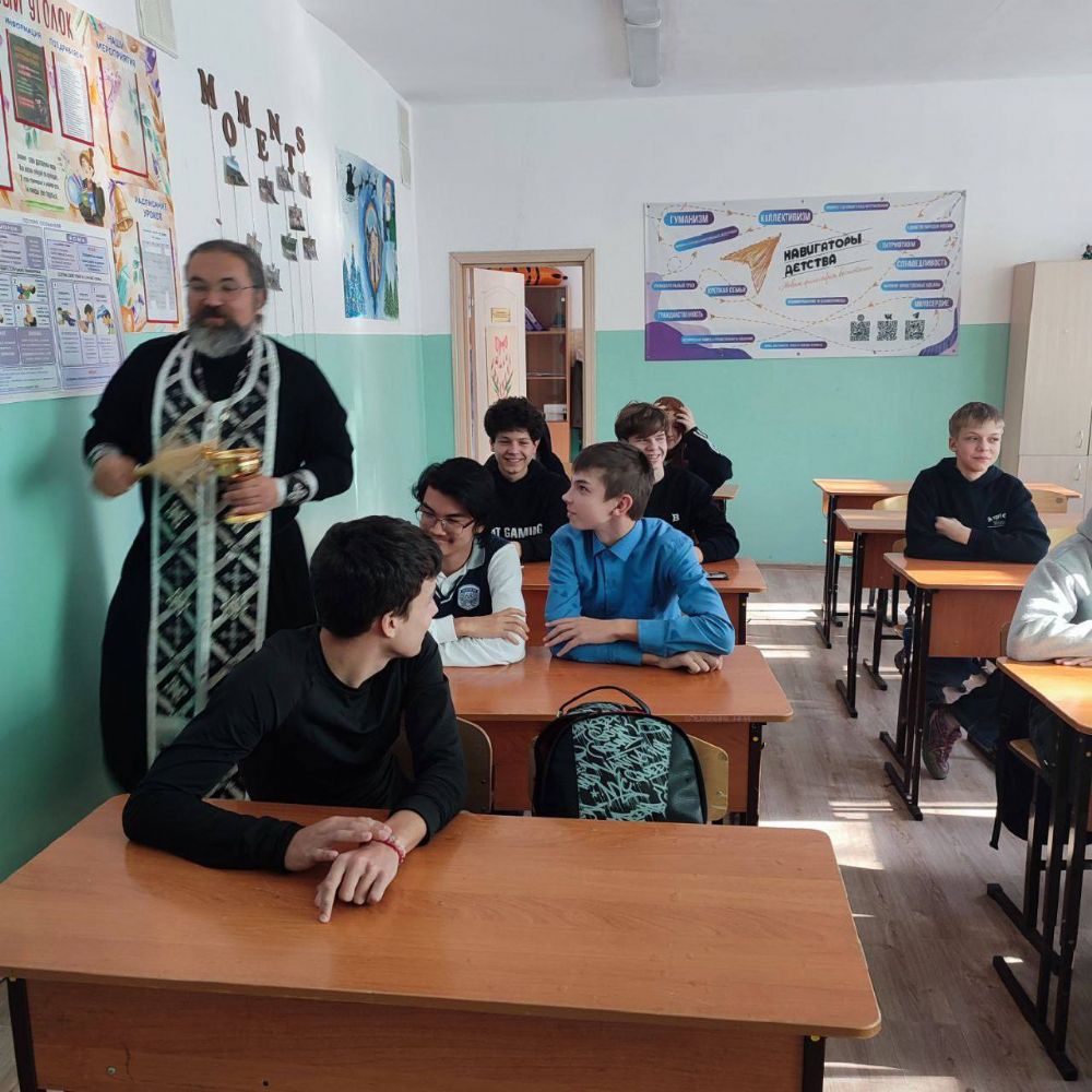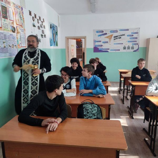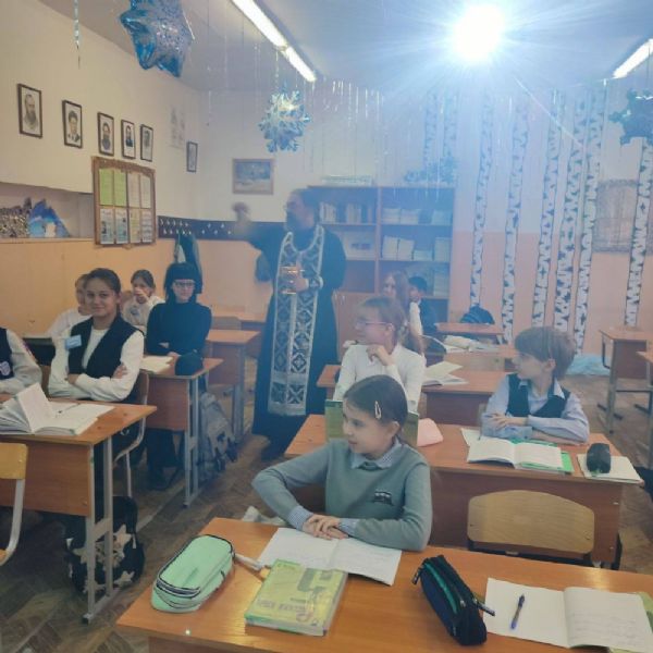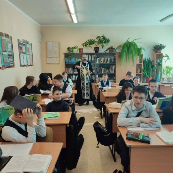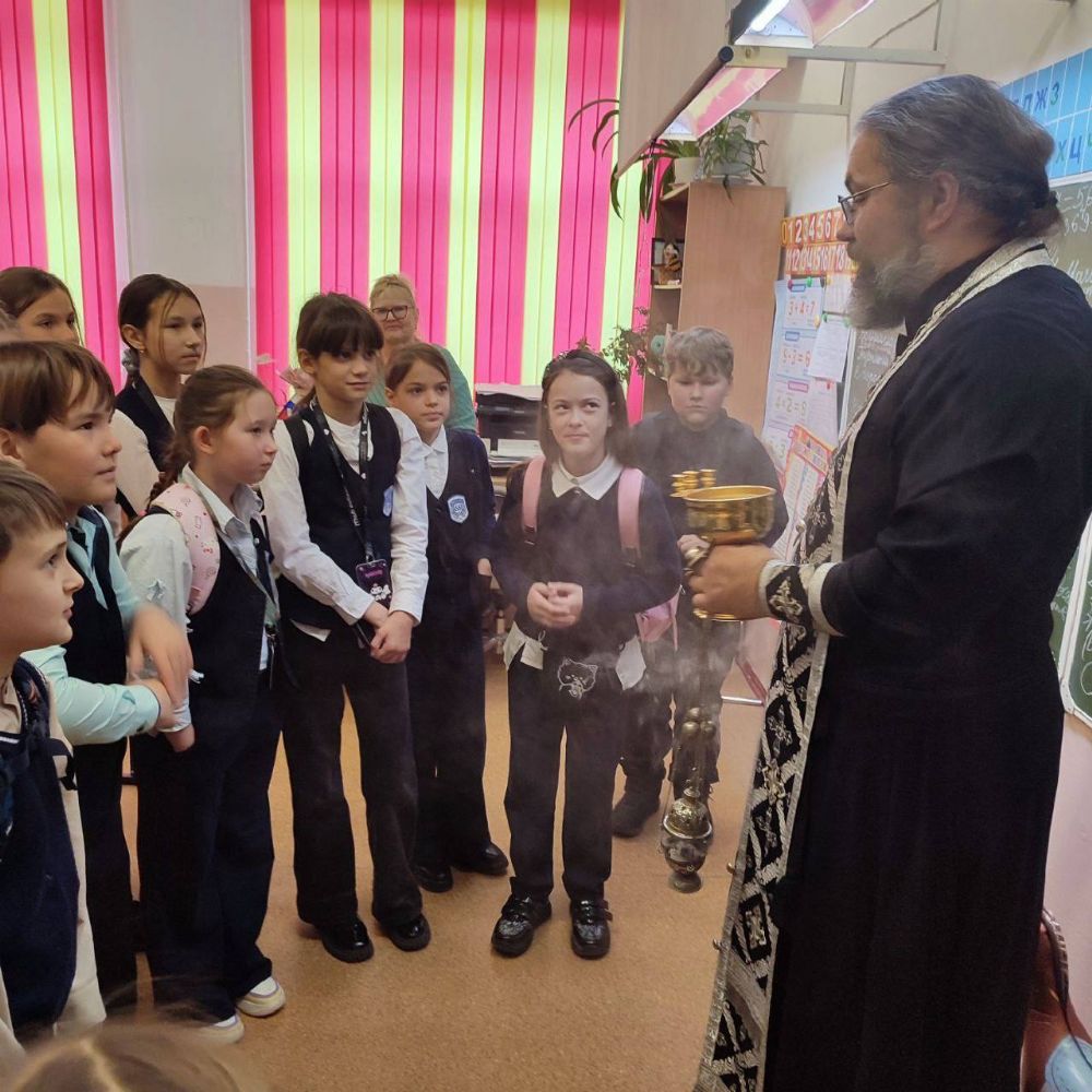 С молитвой и кроплением святой водой отец Илия обошел все кабинеты и помещения школы. Освящение совершалось прямо во время учебного процесса, поэтому учащиеся имели возможность познакомиться с батюшкой и немного побеседовать с ним. Всего в образовательном учреждении обучается около тысячи детей.