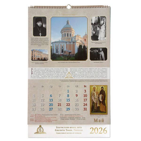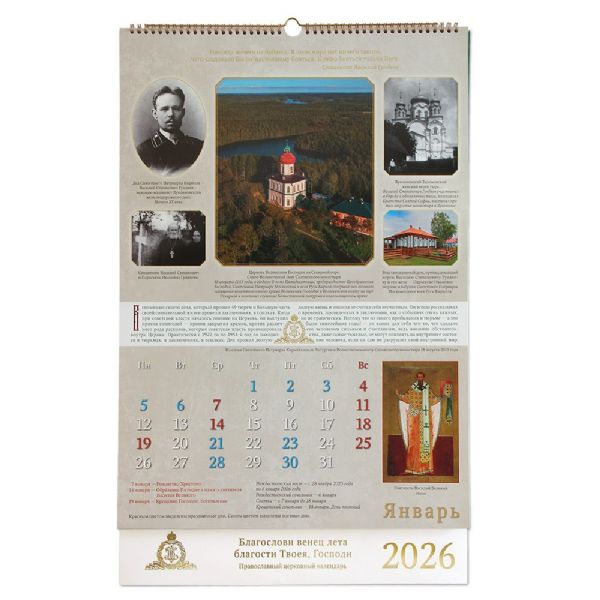Празднично оформленный календарь сделан в формате А2 на пружине. Календарная сетка крупная, указаны главные праздники и посты.