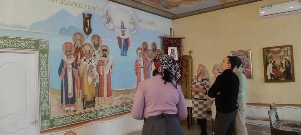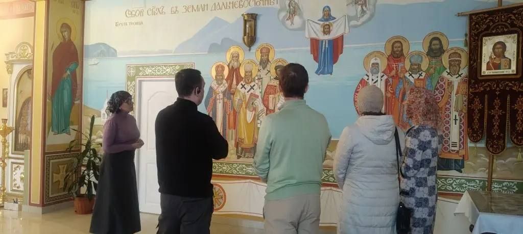 В ходе встречи Ирина Ивановна подробно рассказала гостям об устройстве храма, истории его прихода и святынях. Особое внимание было уделено не так давно прибывшим в храм, но очень почитаемым иконам: образу 40 мучеников Севастийских и иконе Божией Матери «Всецарица». Также участники экскурсии узнали о святых, в земле Дальневосточной просиявших, и их значении для духовной жизни региона.